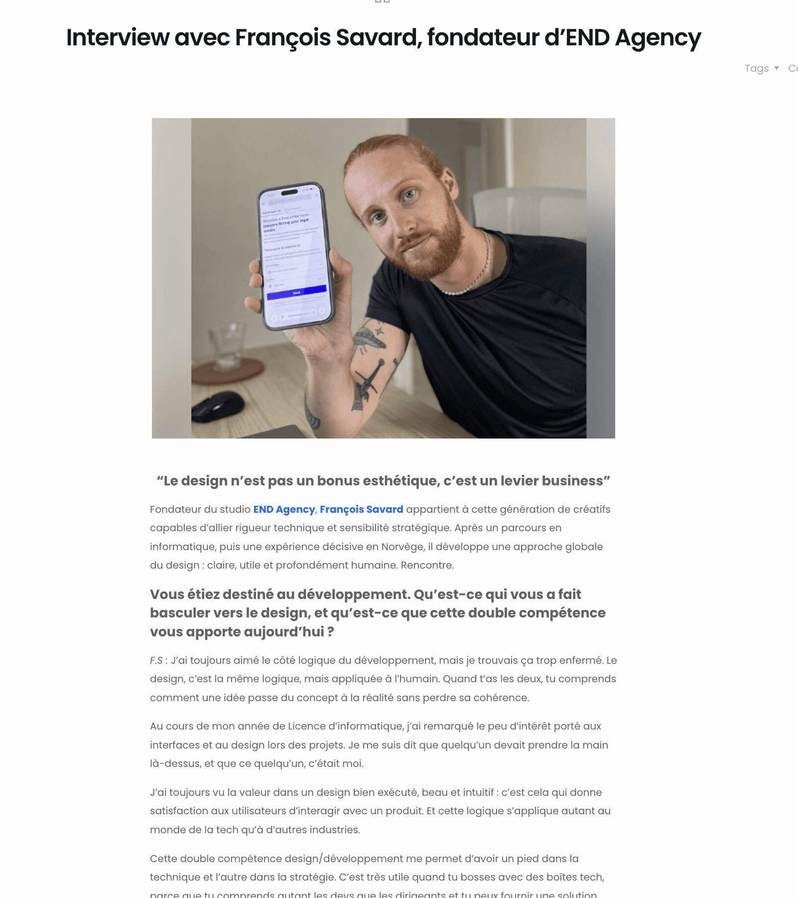 Ce parcours a posé les bases d’END Agency, mon studio de design créé après mon expérience nordique. J’y conçois des produits end-to-end pour des entreprises en fintech, crypto, marketplaces ou B2C, avec toujours le même objectif: créer quelque chose de plus clair, plus rapide, plus simple à utiliser. Pour moi, un bon design est invisible. Il est fluide, intentionnel et intemporel. J’applique l’idée de l’effet cumulatif, où les petits détails répétés créent un avantage durable. C’est ce qui fait revenir les clients.